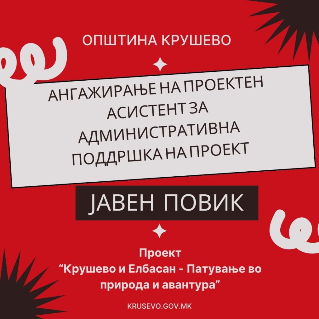 Вести Соопштенија ЈАВЕН ОГЛАС 26/11/202526/11/2025 Jasmina Dimoska Во прилог ЈАВЕН ОГЛАС за ангажирање на проектен асистент – административна поддршка на проектот „Крушево и Елбасан – Патување во природа и авантура“ Javen oglasПреземи